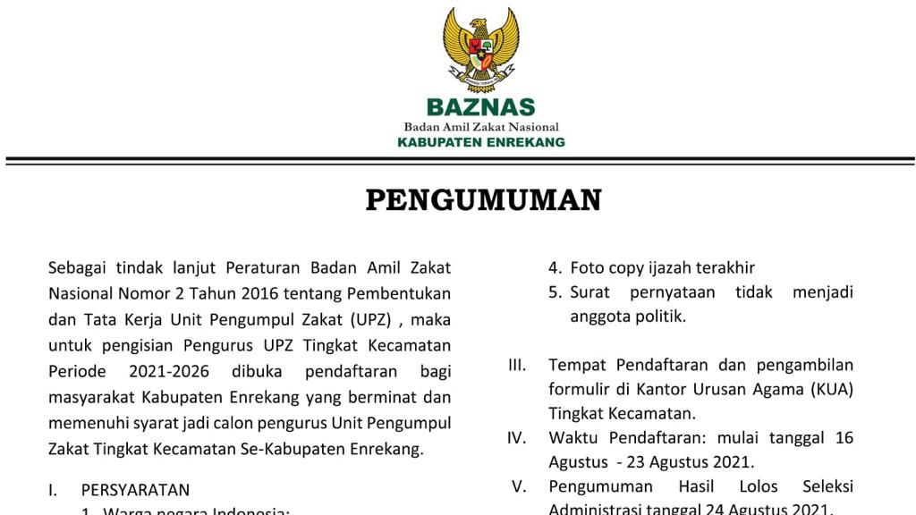 Sebagai tindak lanjut Peraturan Badan Amil Zakat Nasional Nomor 2 Tahun 2016 tentang Pembentukan dan Tata Kerja Unit Pengumpul Zakat (UPZ) , maka untuk pengisian Pengurus UPZ Tingkat Kecamatan Periode 2021-2026 dibuka pendaftaran bagi masyarakat Kabupaten Enrekang yang berminat dan memenuhi syarat jadi calon pengurus Unit Pengumpul Zakat Tingkat Kecamatan Se-Kabupaten Enrekang.