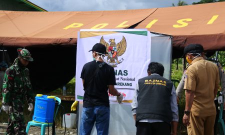 Badan Amil Zakat Nasional (Baznas) Enrekang menyerahkan Bilik Sterilisasi Pencegah Virus Corona sekaligus melakukan simulasi di posko covid-19 di perbatasan Enrekang-Toraja, Desa...