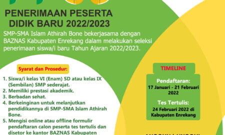 Badan Amil Zakat Nasional (Baznas) Kabupaten Enrekang kembali membuka pendaftaran seleksi beasiswa untuk masuk sekolah Islam Athirah Bone tingkat SMP dan SMA,...